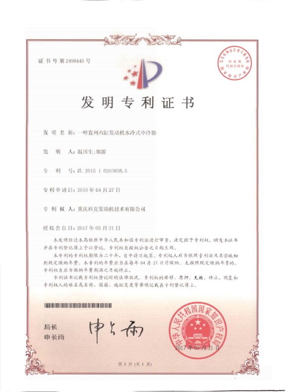ZL201510203838.5-A water-cooled intercooler for inline six-cylinder engine-Certificate